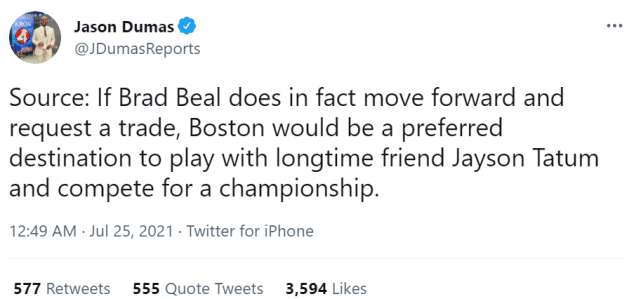 某个熟悉比尔想法的消息源告知B/R:“比尔知道自己必须在选秀大会前做出一个决定。”此前,比尔曾坚持表示自己想要留在奇才,但现在情况已经发生变化。Fischer表示,比尔愿意前往的球队包括凯尔特人、勇士、热火和费城,而Dumas报道称,比尔最想去的球队是凯尔特人,他想和多年好友杰森-塔图姆一起打球,联手争夺总冠军。