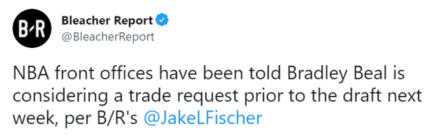 来源:24直播网07-25 10:3824直播网讯 北京时间7月25日,据Bleacher Report(B/R)记者Jake Fischer报道,奇才球星布拉德利-比尔考虑在选秀大会前申请交易,而B/R的另一位记者Jason Dumas爆料称,如果比尔决定申请交易,他的首选下家将是凯尔特人。