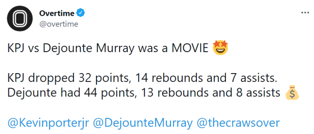 来源:24直播网07-25 10:2224直播网讯 北京时间7月25日,火箭队21岁新星小凯文-波特参加西雅图The Crawsover联赛,单场轰下32分14篮板7助攻,他和马刺后卫德章泰-穆雷多次对位,展现了全面的进攻能力。穆雷也在这场比赛中得到44分13篮板8助攻。两人来自同一所西雅图高中,是多年的好友。美媒Overtime感慨两人的对决就如同一部电影。最终,小波特所在的球队112-99获胜。