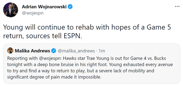 第二天,老鹰官方更新了特雷-杨的伤情。他接受了核磁共振检查,检查结果显示右脚出现一处骨挫伤。当时球队给出的G4状态是questionable(出战成疑,上场可能50%)。不过,显然,短暂的休息时间,并没有让杨的踝伤有明显好转,他还是缺席了这场重要的比赛。