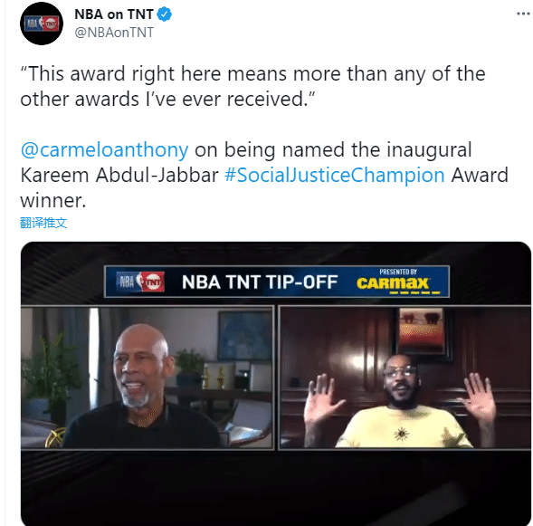 获得贾巴尔大奖之后,安东尼连线贾巴尔老爷子,甜瓜表示:这个奖项比我以前所获得的任何其他奖项都重要。