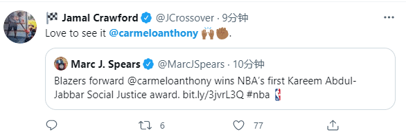 来源:24直播网06-30 14:4124直播网讯 北京时间6月30日,NBA又一项大奖出炉,安东尼赢得以贾巴尔的名字来命名的年度社会正义冠军奖,成为NBA首位获得此项大奖的球员;这一个全新奖项将每年评选一次,表彰那些追求社会正义,维护联盟几十年来平等、尊重和包容价值观的球员。