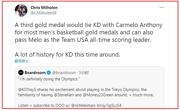 而据纽约记者Chris Milholen报道,杜兰特参加这届奥运会,将有机会创下两大里程碑: