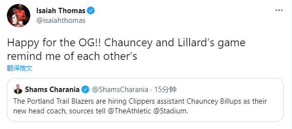 小托马斯发推写道:恭喜我的老哥,比卢普斯联手利拉德的比赛让人们想起了彼此。