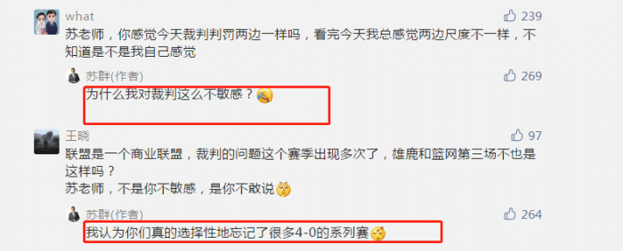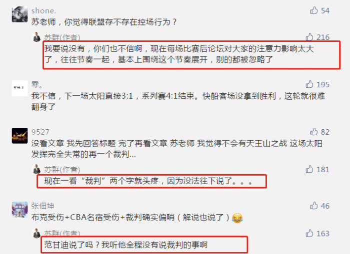 通过这一系列回应来看,苏群老师的答案很明显了,他不觉得联盟在控制比赛,毕竟季后赛至今,4-0的例子比比皆是。雄鹿首轮4-0横扫热火,太阳次轮4-0横扫掘金,如果联盟真的想要把系列赛拖久一点,那这两轮比赛肯定不会在4场内就结束。