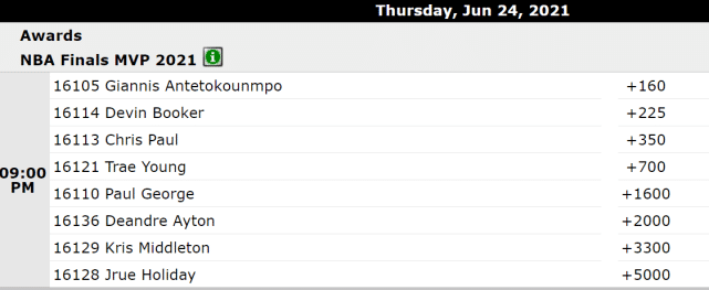 最新的FMVP赔率排名如下:字母哥(+160)、布克(+225)、保罗(+350)、特雷-杨(+700)、乔治(+1600)、艾顿(+2000)、米德尔顿(+3300)、霍乐迪(+5000)。