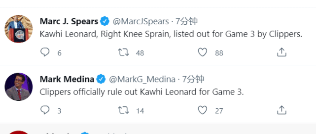 莱昂纳德在此前对阵爵士的第四场比赛中,与英格尔斯碰撞后,出现了膝盖伤势。至今,没有任何明确的消息报道莱昂纳德膝伤的严重程度。快船方面的保密工作也做得很好,莱昂纳德没有复出时间表,也没有宣布赛季报销。