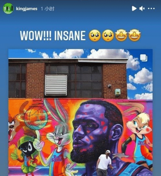在昨天詹姆斯还转发晒出一位艺术家为他的电影《空中大灌篮2》创作的壁画,里面就是詹姆斯新电影的模样,还有几个电影中的动画好搭档,詹姆斯配文:“哇哦!!!我疯了。”