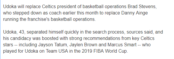 为何凯尔特人最终选择乌度卡?沃纳罗斯基还透露,除了被史蒂文斯看好之外,乌度卡还得到了绿军阵中几位核心明星球员的大力支持与推荐——包括塔图姆、杰伦-布朗和斯玛特。这三位球员都曾在乌度卡麾下参加了19年男篮世界杯。