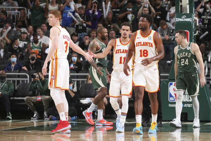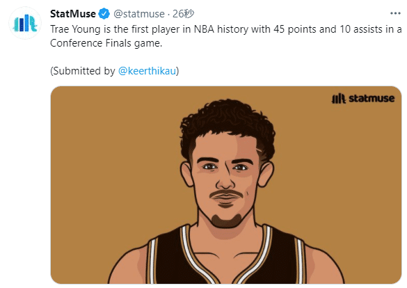 22岁特雷杨全场48分11助攻,一个人独造72分——直接得分和助攻队友得分;末节最后16分中有14分和特雷杨有直接关系;特雷杨一战封神,狂刷多项历史纪录——历史上首位在分区决赛中打出45+10的球员,22岁在分区决赛首秀得分超越科比,和詹姆斯并列历史第一。