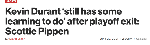 主持人询问皮蓬,到了季后赛,杜兰特是否将他的比赛提升到了另一个水准。“我觉得杜兰特一直都是这样的球员,”皮蓬说道,“但我看到了很多关于‘他是否已经超越勒布朗-詹姆斯’的讨论,超越勒布朗,需要的不仅仅是个人的努力。”