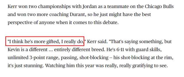 科尔和乔丹一起赢下过两座总冠军,他了解乔丹,也了解杜兰特。对比两人的天赋,科尔说道:“我认为他(杜兰特)更有天赋,我真的这么想。凯文是一个完全不同的球员,他身高6尺11,拥有后卫的技能,不受限制的三分射程,能传球能盖帽,他在篮下的盖帽太棒了。今年再次看到他打球,我很欣慰。”