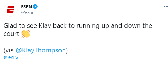 美媒ESPN转发汤普森动态和训练照,发推写道:很开心能够看到克莱在球场上跑来跑去。