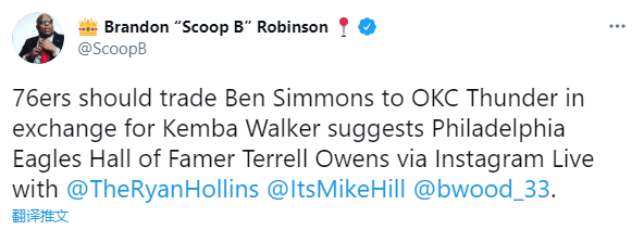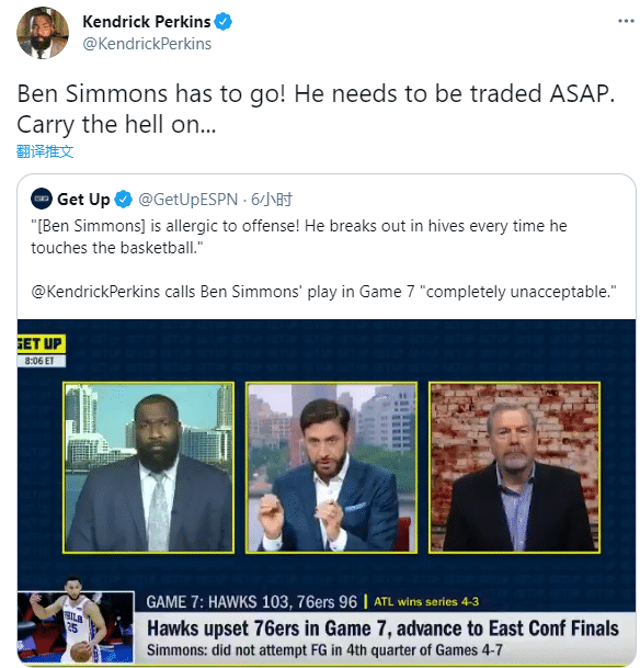 名嘴帕金斯提出同样的建议:本-西蒙斯对进攻过敏,他一摸球就像起了麻疹似的;西蒙斯该立即走人,费城该赶紧交易他。