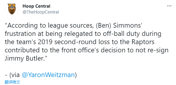 美媒Hoop Central报道,2019年东部半决赛被猛龙淘汰,本-西蒙斯对没有球权感到沮丧,这导致费城管理层决定不和巴特勒续约。