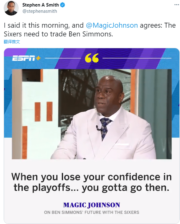 来源:24直播网06-22 11:2124直播网讯 名嘴“美国杨毅”直言本-西蒙斯必须离队,湖人名宿魔术师同意A-史密斯的观点,直言:当你在季后赛失去信心时,你就必须走了;魔术师认为76人需要交易西蒙斯。