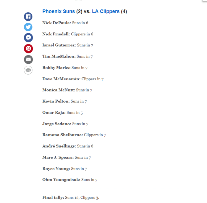 来源:24直播网06-21 10:3624直播网讯 北京时间6月21日,西部决赛太阳和快船的首战,就将在菲尼克斯进行。西决之前,ESPN15名专家对于这轮系列赛做了预测。结果显示12人看好太阳,3人看好快船。
