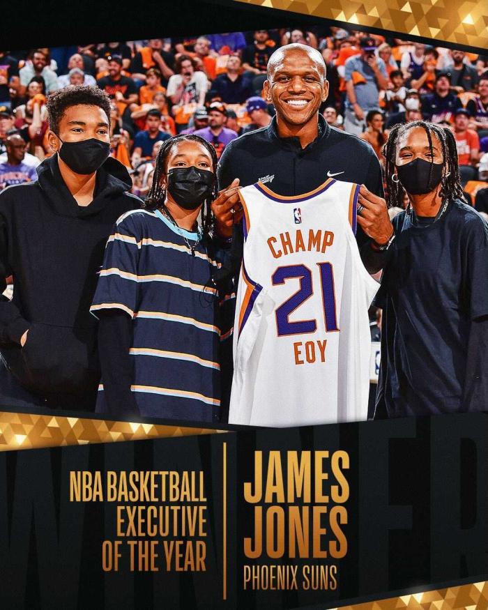 来源:24直播网06-21 10:0624直播网讯 北京时间6月21日,NBA官方正式宣布本赛季年度最佳总经理,太阳GM詹姆斯-琼斯险胜爵士总经理荣获此项大奖;琼斯获得9张第选票总计拿到65分,西决大战赛前,琼斯及其家长和太阳球迷一起庆祝,举起一件纪念版球衣。
