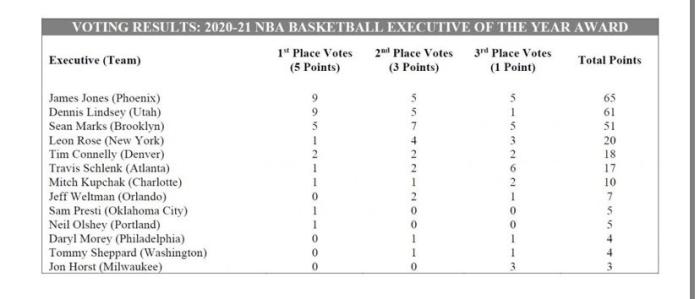 从具体投票结果来看,太阳总经理詹姆斯-琼斯获得9张第一选票、5张第二选票和5张第三选票,总共获得65分;爵士总经理林赛也获得9张第一选票,总共61分,篮网总经理肖恩-马克总共51分;琼斯以4分的优势力压林赛夺得年度最佳总经理。