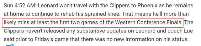 此前报道称,莱昂纳德遭遇了前十字韧带扭伤,有记者甚至透露,他需要进行手术治疗。如果是手术治疗,莱昂纳德的季后赛之旅就已经结束,但从目前情况来看,快船和莱昂纳德都偏向于保守治疗,他还有机会回归。