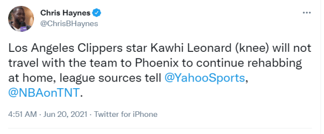 来源:24直播网06-20 10:4624直播网讯 北京时间6月20日,据名记克里斯-海耶斯报道,快船球星科怀-莱昂纳德因膝伤将不会随队前往菲尼克斯,他将继续留在洛杉矶进行康复。美媒跟进报道称,这意味着他大概率至少缺席西部决赛的前两场比赛。