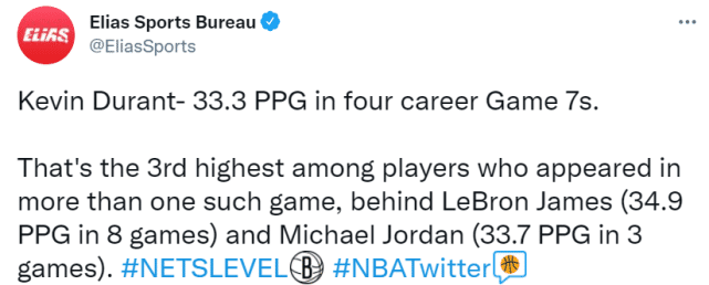 只有詹姆斯和乔丹的G7场均得分超过杜兰特。詹姆斯生涯参加过8场抢七大战,场均34.9分,而乔丹生涯参加过3场抢七大战,场均33.7分。如果杜兰特这场比赛有出色的得分表现,他的G7场均得分有望超过这两位巨星。