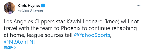 来源:24直播网06-20 10:2624直播网讯 北京时间6月20日,快船巨星莱昂纳德最新伤情出炉,据名记海耶斯报道,小卡因膝盖不会随队前往菲尼克斯,继续留在洛杉矶接受治疗,这意味着小卡继续伤停,因伤缺席西决G1。