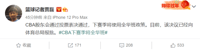 来源:24直播网06-18 15:1324直播网讯 北京时间6月18日,名记贾磊爆料一个震惊的消息,新赛季的CBA将执行全华班,目前,该决议已经向体育总局报批。