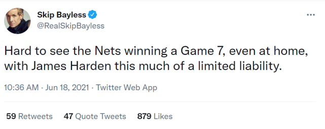 不过,也有不少人看好雄鹿能够借着G6的气势,继续赢球,并最终拿下这轮系列赛的胜利。名嘴斯基普-贝勒斯在社媒上写道:“不看好篮网赢下抢七大战,即便他们拥有主场优势, 因为哈登能力严重受限。”哈登的腿筋伤势尚未完全康复,而且这是短期内无法彻底痊愈的伤,再加上欧文不可能在这轮系列赛复出,所以篮网的三巨头,充其量只有1.5个巨头了。