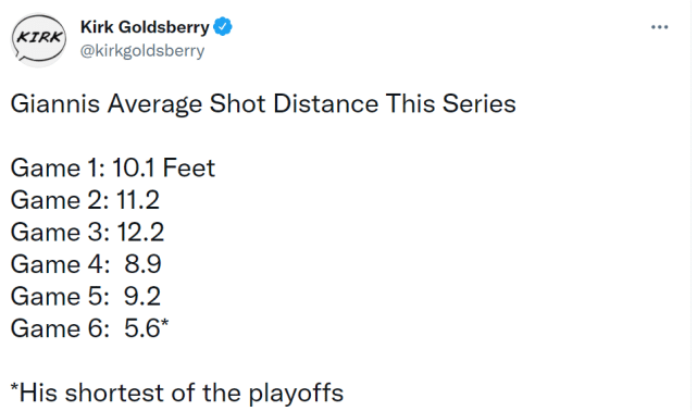 本场比赛,字母哥没有三分出手,数据专家Kirk Goldberry指出,对篮网的G6,也是字母哥平均出手距离最近的一场季后赛,只有5.6英尺。这或许是字母哥的获胜诀窍,那就是全力接近篮筐进攻。