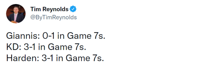 这是字母哥生涯第二次抢七大战,之前唯一一次他输了。而哈登和杜兰特都将迎来生涯第五次抢七大战,此前四次,两人都是3胜1负。雄鹿队史上客场抢七是0胜7负,字母哥能率队打破魔咒吗?