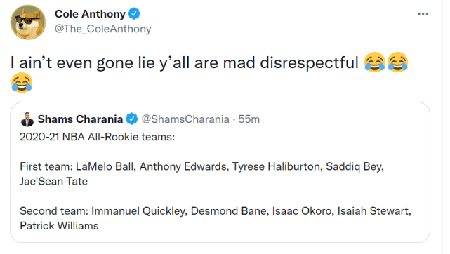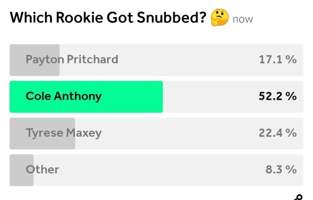 球迷们似乎也很认可科尔-安东尼。在一项关于这次最佳新秀阵容,哪位新秀是遗珠的调查中,科尔-安东尼得到52.2%的票数,排名第一,位居第二的是费城的马克西(22.4%),排名第三的是凯尔特人的普理查德(17.1%),另有8.3%的球迷认为是其他人。