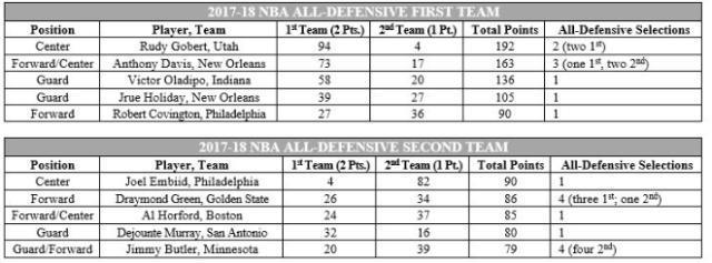 2017-18赛季NBA最佳防守阵容名单一览