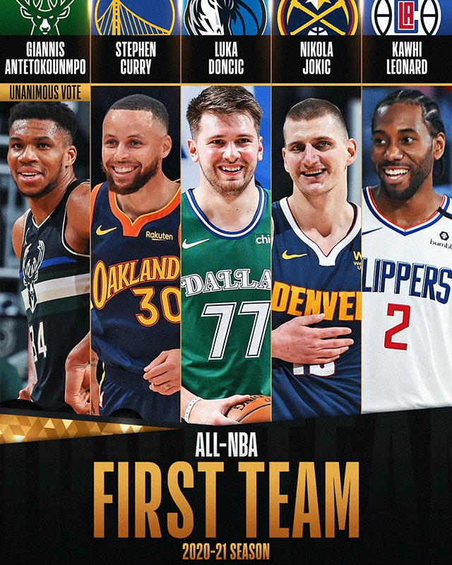 扬尼斯-安特托昆博(雄鹿)、斯蒂芬-库里(勇士)、卢卡-东契奇(独行侠)、尼古拉-约基奇(掘金)、科怀-伦纳德(快船)。