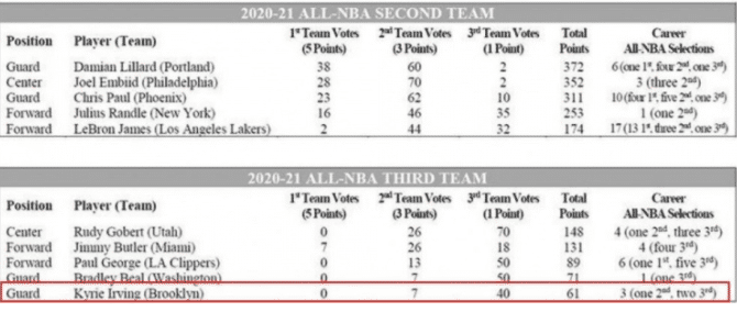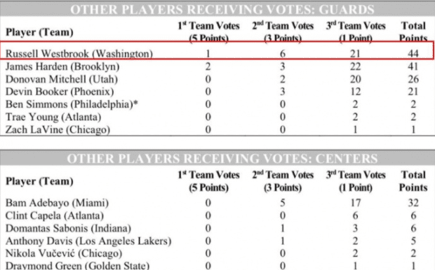 威少和欧文的得票差距很少,根据数据显示,威少得到1张第一选票,6张第二选票,21张第三选票。欧文是0张第一选票、7张第二选票和40张第三选票。分数对比威少为44分,欧文是61分,相差正好17分。