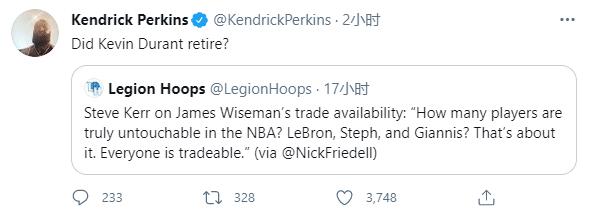来源:24直播网04-18 15:4724直播网讯北京时间4月18日,帕金斯回应了科尔此前的言论,科尔此前在接受采访时表示现役仅詹姆斯、库里、字母哥是非卖品不会被交易,帕金斯转发了相关的推特并写道:“凯文-杜兰特已经退役了吗?”