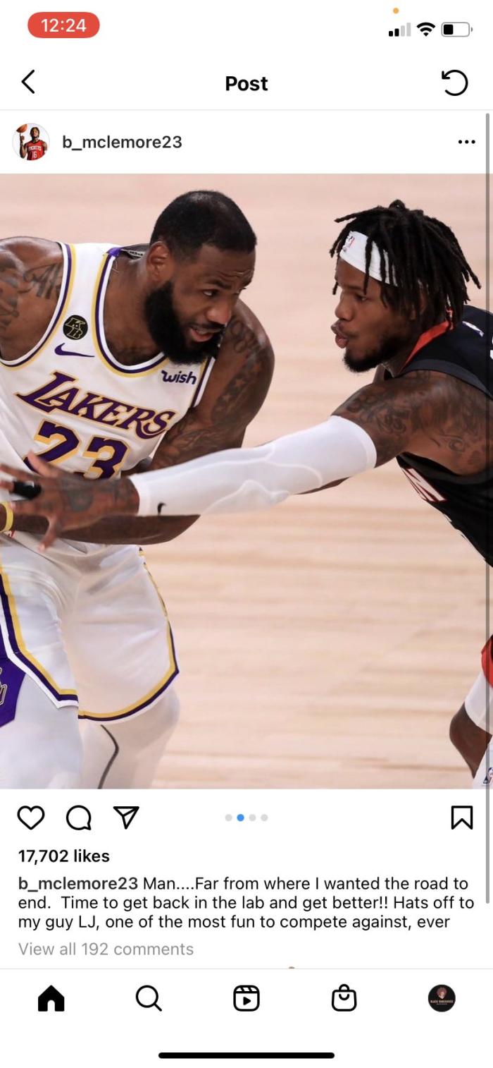 他原本穿过23号和16号,但是在湖人队中23号属于詹姆斯,16号是昔日球队名宿大加索尔的球衣号码,出于多方面考虑,麦克勒莫才穿新号码的吧!球迷和记者也挖出了麦科勒摩在去年9月代表火箭打完与湖人季后赛系列赛后发布的Ins内容,他转发了多张与詹姆斯对位的照片并附文“天啊……这远远不是我希望道路终结的位置。是时候回归训练馆并变得更好了!向我的哥们勒布朗-詹姆斯脱帽致敬,他是有史以来交手时最有趣的对手之一!”