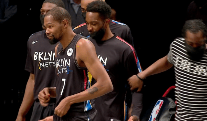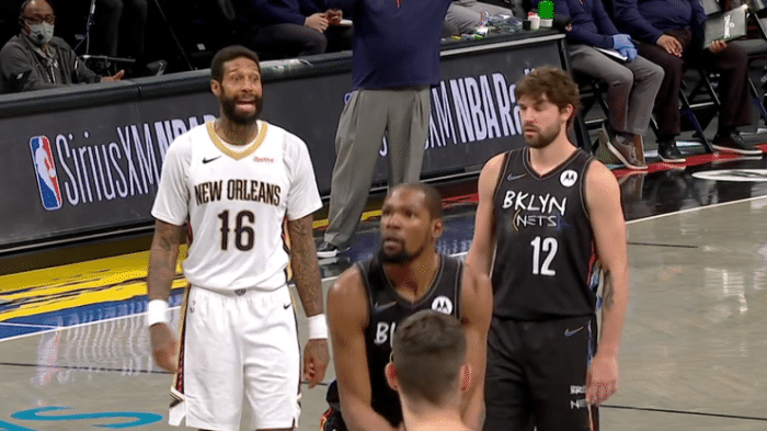 随后杜兰特又是面对詹姆斯-约翰逊的防守,出手三分造成犯规,他一登场就打爆了这位鹈鹕悍将,表现相当强势,带领篮网扩大领先优势。
