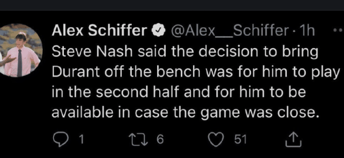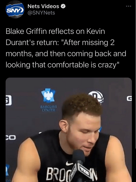 篮网主帅史蒂夫-纳什表示:“对于他感觉良好、打得出色,我们十分激动。能看到他的笑容对我来说很重要。他爱比赛胜过其他,他需要篮球。当有KD时,打球变得简单。他让队友变得更好,他吸引很多防守注意力,在场上扩大了空间。他能够创造投篮,他是史上最佳之一。”