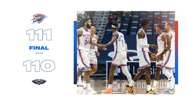 雷霆111-110险胜鹈鹕 贝兹利20+12 锡安29+6