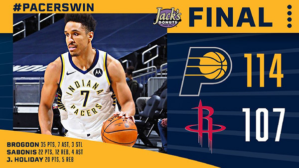 步行者(6-2):布罗格登35分7助攻3抢断,奥拉迪波18分9篮板2抢断,萨博尼斯22分12篮板4助攻,J-霍勒迪20分5篮板,麦克德莫特6分2篮板,A-霍勒迪7分3助攻。