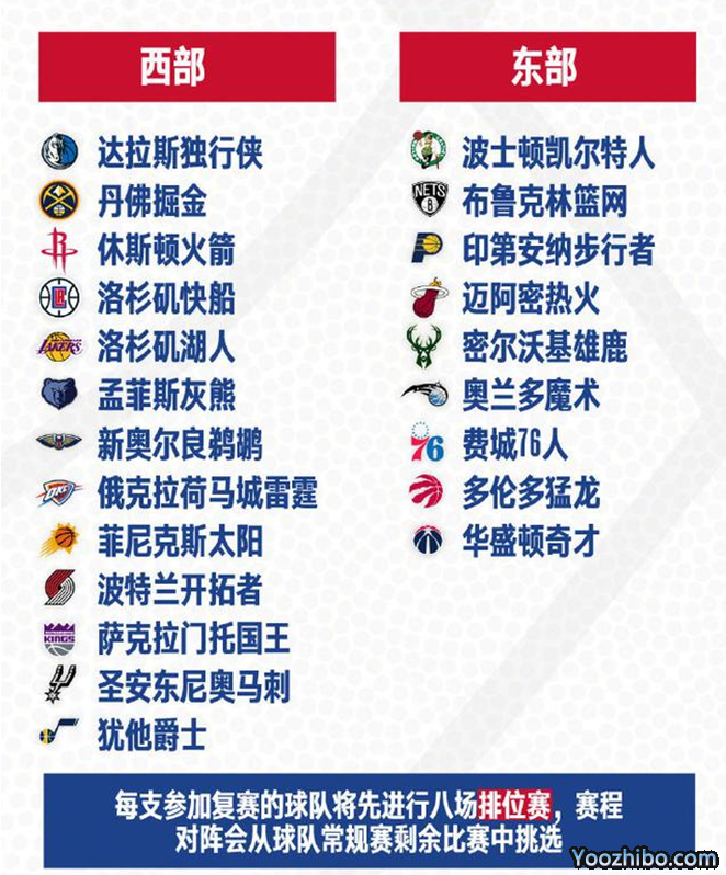 NBA复赛后将有22支球队参赛,每支球队将进行8场排位赛,赛程对阵会从各队常规赛剩余的比赛中挑选。勇士、森林狼、骑士、老鹰、活塞、尼克斯、公牛和黄蜂等8支球队的赛季已经提前结束。