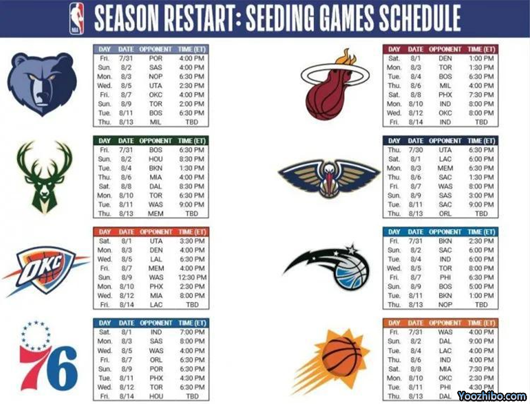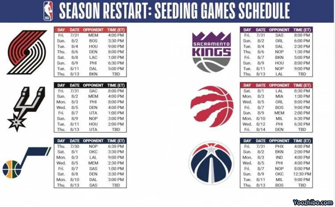 8月10日 奇才-雷霆,灰熊-猛龙,马刺-鹈鹕,魔术-凯尔特人,76人-开拓者,火箭-国王,篮网-快船;