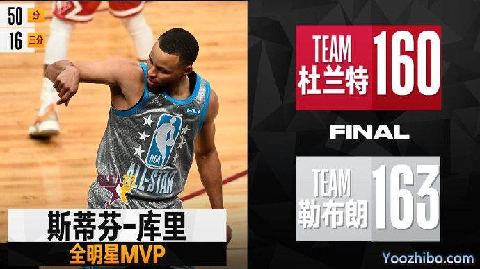 24直播网 2月21日讯 在结束新秀挑战赛和各项单项争夺后,杜兰特队和詹姆斯队的全明星正赛大餐正式开启,今年正赛规则和去年一致,前三节累计总得分中,分数更高的一方加上24分为目标分数,率先得到目标分数一方为获胜方。首节争夺杜兰特队主攻内线上演各种暴力扣篮,詹姆斯队则外线手风更顺命中7记三分,东契奇最后时刻连中两记三分帮助球队以2分优势赢下首节争夺。次节两队防守强度稍稍加强但进攻端不乏精彩,库里这一节独中6记三分砍下18分,不过最终仍然还是杜兰特队笑到最后赢下第二节对决,上半场两队各赢一节,总分上杜兰特1分领先。第三节库里延续神准三分,他这一节再度轰进7记三分,不过杜兰特队整体发挥更稳,这一节打成平手的情况下总比分领先1分。末节目标比分为163分,双方这一节交替拿分分差不大悬念也一直留到最后,不过詹姆斯最后跳投杀死比赛。最终,詹姆斯队力克杜兰特队拿下比赛,而投进16记三分的库里荣膺本届全明星MVP。