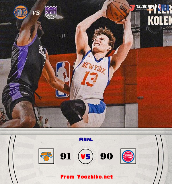 24直播网 7月20日讯 NBA夏季联赛,尼克斯对阵活塞。比赛开始,小杜安-华盛顿撑起尼克斯进攻,单节得分上双,但活塞则是首发五虎全面皆兵,双方展开对攻战,首节尼克斯仅领先1分,次节尼克斯突然陷入3分钟得分荒,尼克斯11-0建立双位数领先,詹金斯挑篮破荒,但尼克斯替补发挥出色能给出回应,半场尼克斯建立10分领先。下半场,活塞再度进攻端断电,打了6分多钟仅得6分,尼克斯顺势拉开20分以上领先,好在萨瑟里突外投连续砍分缩至13分,末节尼克斯也突然断电,4分钟内仅得1分,活塞9-1小高潮追至5分,尼克斯接连杀伤走上罚球线止血,萨瑟三分追到仅剩1分,比分持续胶着,萨瑟三分和霍兰补篮都没把握住机会,但尼克斯发球5秒违例,萨瑟绝杀中投不中,最终尼克斯91-90险胜活塞。