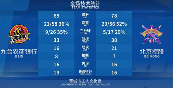 24直播网讯 9月20日讯 CBA季前赛山西晋城赛区,吉林对阵北控。一开场,双方势均力敌,比分交替领先,北控突然发力打出10-2的攻击波,次节吉林内外开花紧咬比分,北控连造杀伤通过罚球稳住局势,半场打完北控41-35仍有6分优势。下半场,吉林命中率下降,张帆连中三分率队将分差拉开到20分,末节吉林里突外投苦苦追赶,北控稳扎稳打将优势保持到最后。最终,北控78-65轻取吉林。