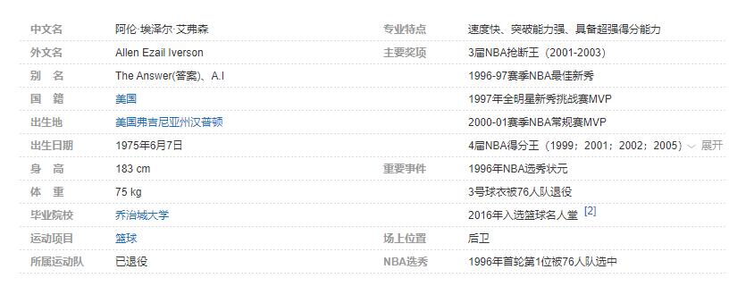 阿伦·艾弗森(Allen Iverson),1975年6月7日出生于美国弗吉尼亚州汉普顿,前美国职业篮球运动员,司职后卫(双能卫),绰号“答案”(The Answer)/AI,曾任美国男篮梦之队队长 。个人简介: