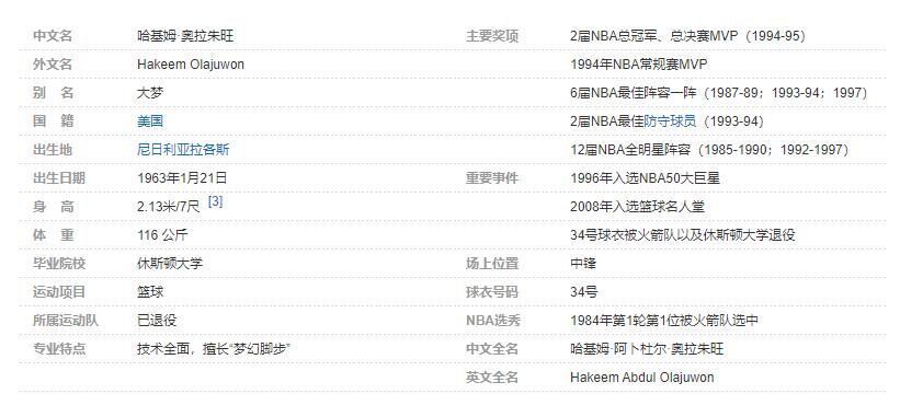 哈基姆·奥拉朱旺(Hakeem Olajuwon),1963年1月21日出生于尼日利亚拉各斯,前尼日利亚裔美国职业篮球运动员,司职中锋,绰号“大梦”(The Dream) 。个人简介: