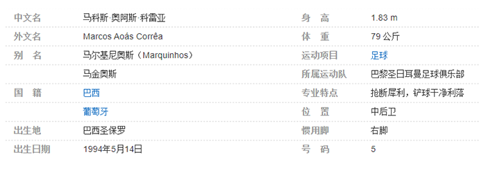 马尔基尼奥斯(Marquinhos),全名马科斯·奥阿斯·科雷亚(Marcos Aoás Corrêa),1994年5月14日出生于巴西圣保罗,巴西男子职业足球运动员,场上司职中后卫,效力于法国足球甲级联赛的巴黎圣日耳曼足球俱乐部,亦担任球队队长。