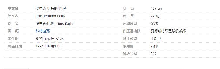 埃里克·巴伊(Eric Bailly)(埃里克·拜利)(Bailly的法语发音译名是巴伊),全名:埃里克·贝特朗·巴伊(Eric Bertrand Bailly),1994年4月12日出生于科特迪瓦班热维尔,科特迪瓦足球运动员,司职中后卫,效力于英格兰超级联赛的曼彻斯特联足球俱乐部。个人简介: